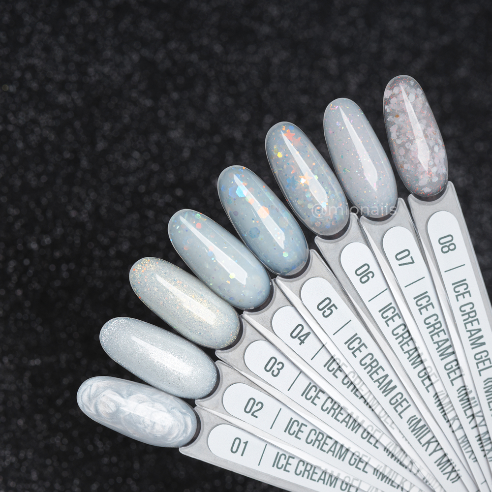 ICE Cream Gel MILKY MIX - это холодные бескислотные гели для укрепления, наращивания на верхние и нижние формы, достраивания углов, поднятия «клюющих» ногтей. В коллекции 8 нежнейших молочных гелей с различными эффектами.