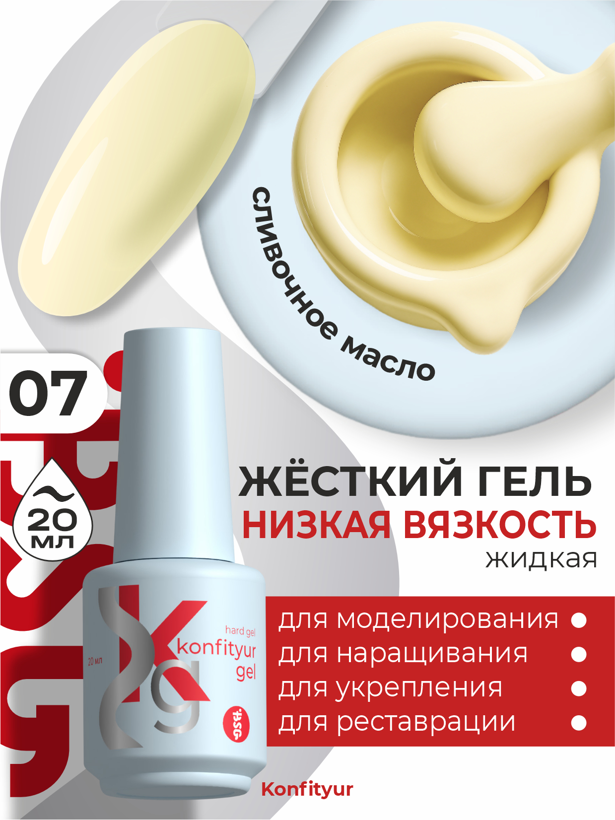 Отзывы Жёсткий гель в бутылке Konfityur №07 НИЗКАЯ ВЯЗКОСТЬ - Светло-лимонный (плотный), 20 мл